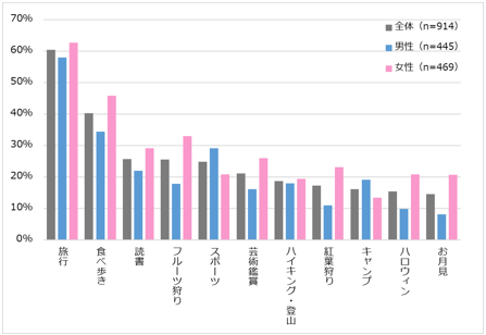 男女別に見てみると、ほとんどの項目で女性の方が多くなっていますが、「スポーツ」「キャンプ」は男性の方が多くなっています。また、全体で最も多かった「旅行」は男女ともに最も多く男性は58.0%、女性は62.7%となりました。