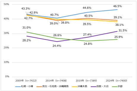TBS生活DATAライブラリ2024年調査「行ってみたい日本の土地」の上位5位を2009年から5年ごとに見てみましょう。 「札幌・小樽」 が2009年から1位をキープし続けており2014年以降、増加傾向となっています。同じく北海道の「函館・大沼」も2014年以降増加傾向となり、年々人気が高まっていることが見てとれます。